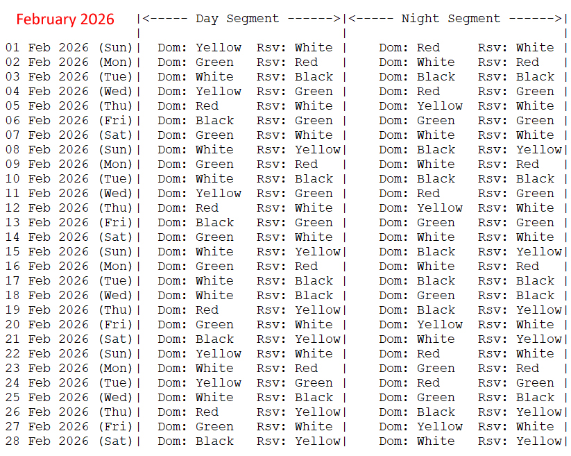 The above table is though not complete Panch-pakshi table. However, it shows a very important information, i.e. about "Dominant" (Dom) and "Recessive" (Rsv) colours of the Day & Night segments of various dates. The "Day segment" starts at Sun-rise and ends at Sunset. The "Night segment" starts at the Sunset, continues through the whole night, and it ends at the next Sun-rise.