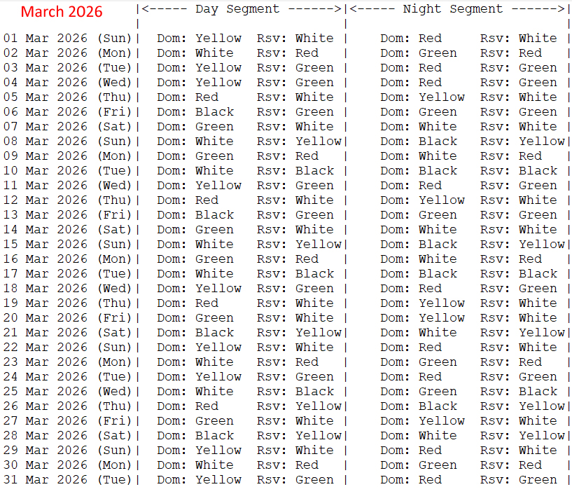 The above table is though not complete Panch-pakshi table. However, it shows a very important information, i.e. about "Dominant" (Dom) and "Recessive" (Rsv) colours of the Day & Night segments of various dates. The "Day segment" starts at Sun-rise and ends at Sunset. The "Night segment" starts at the Sunset, continues through the whole night, and it ends at the next Sun-rise.